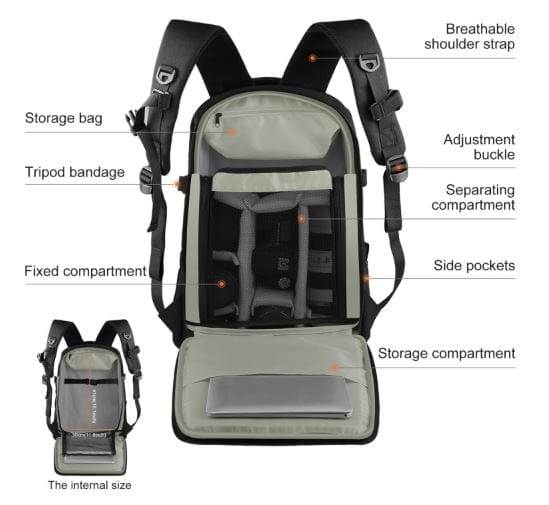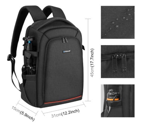 Bolso Puluz de alta calidad para proteger y transportar tus equipos de fotografía y video. El compartimento principal incluye varios bolsillos: para la cámara, portátil, tableta, teléfono, revistas, ropa, objetos pequeños, botella de agua, etc.