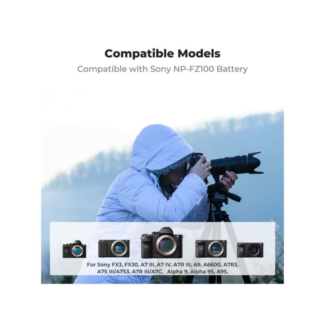 • Es compatible con Sony A7III, A7IV, A7C, FX3, FX30, A9, A6600, A6700, ZV-E1, ZV-E10ii, Alpha 9, A9S, A7R III, A7R IV, A7R V.