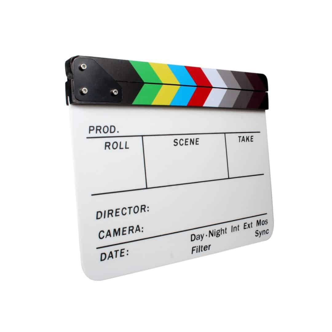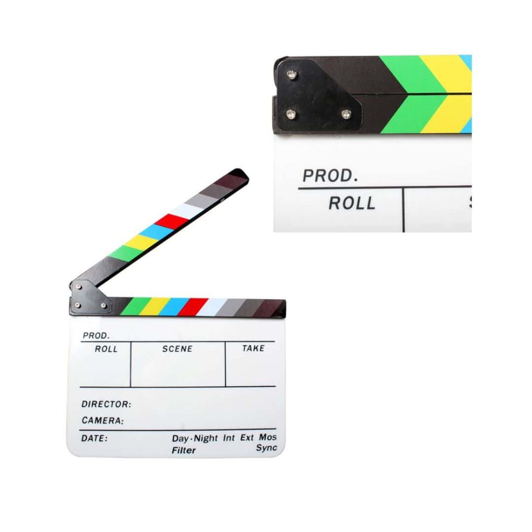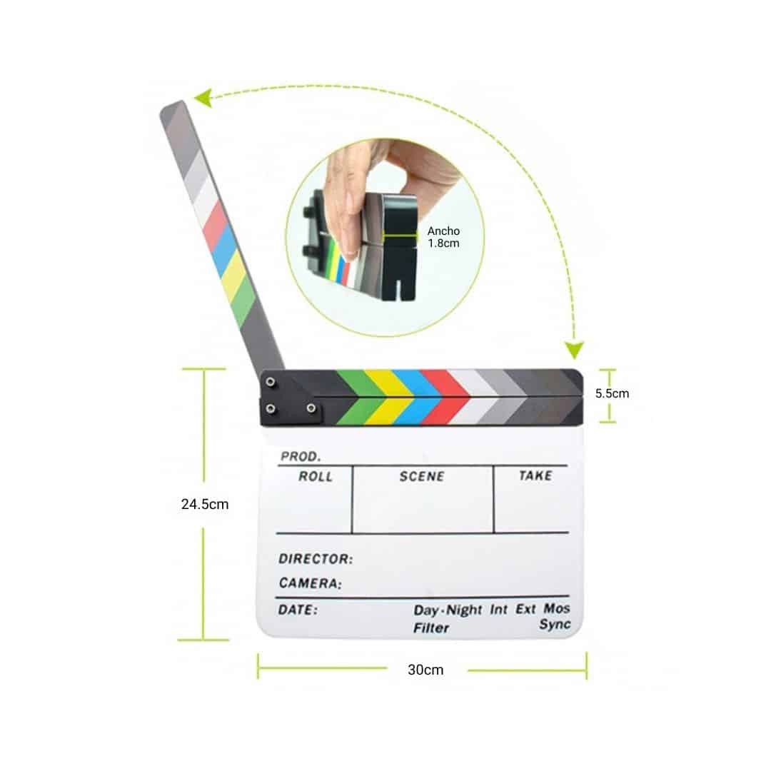La Claqueta de Acrílico colorida, es una herramienta utilizada en la producción de video para sincronizar el audio con la imagen y organizar las tomas.