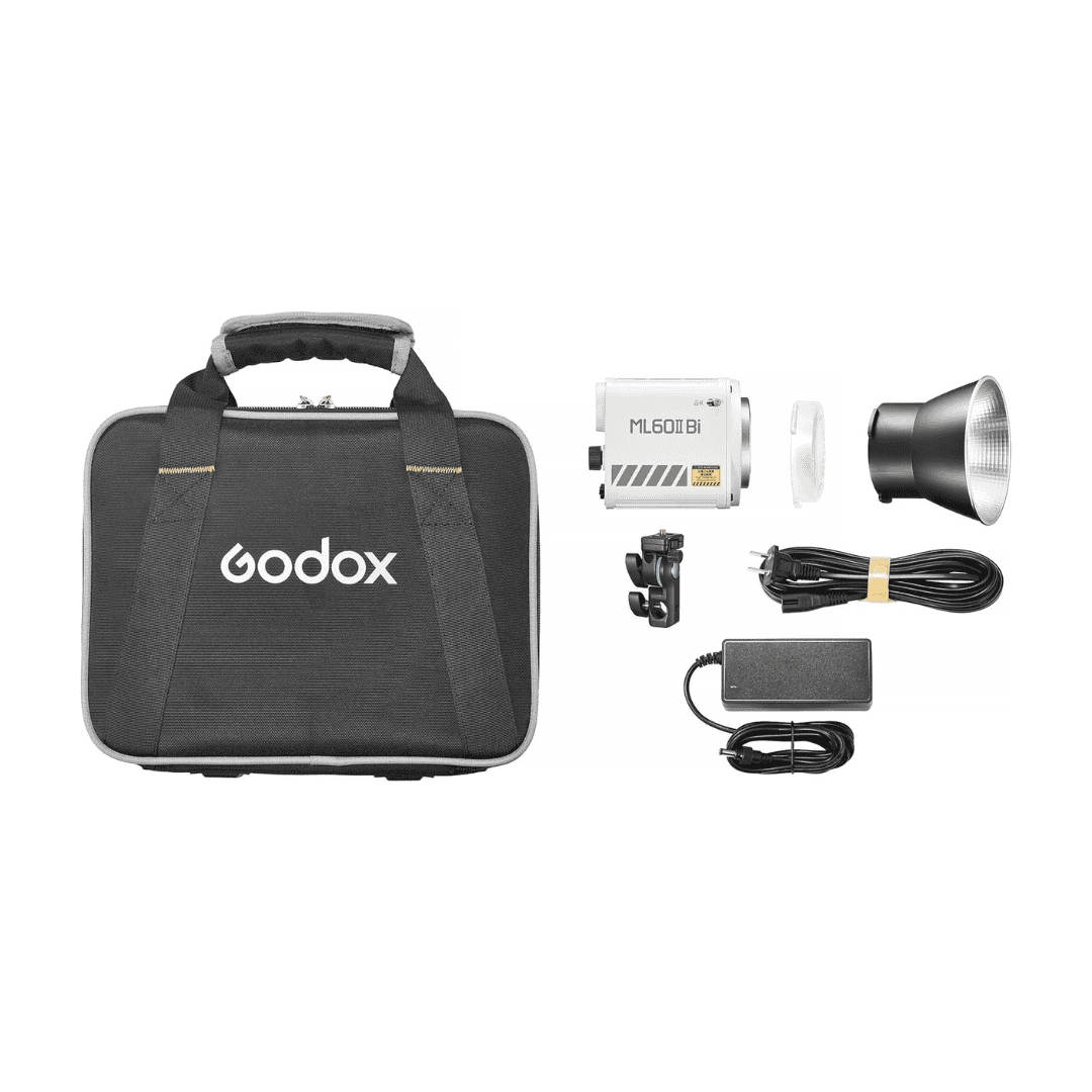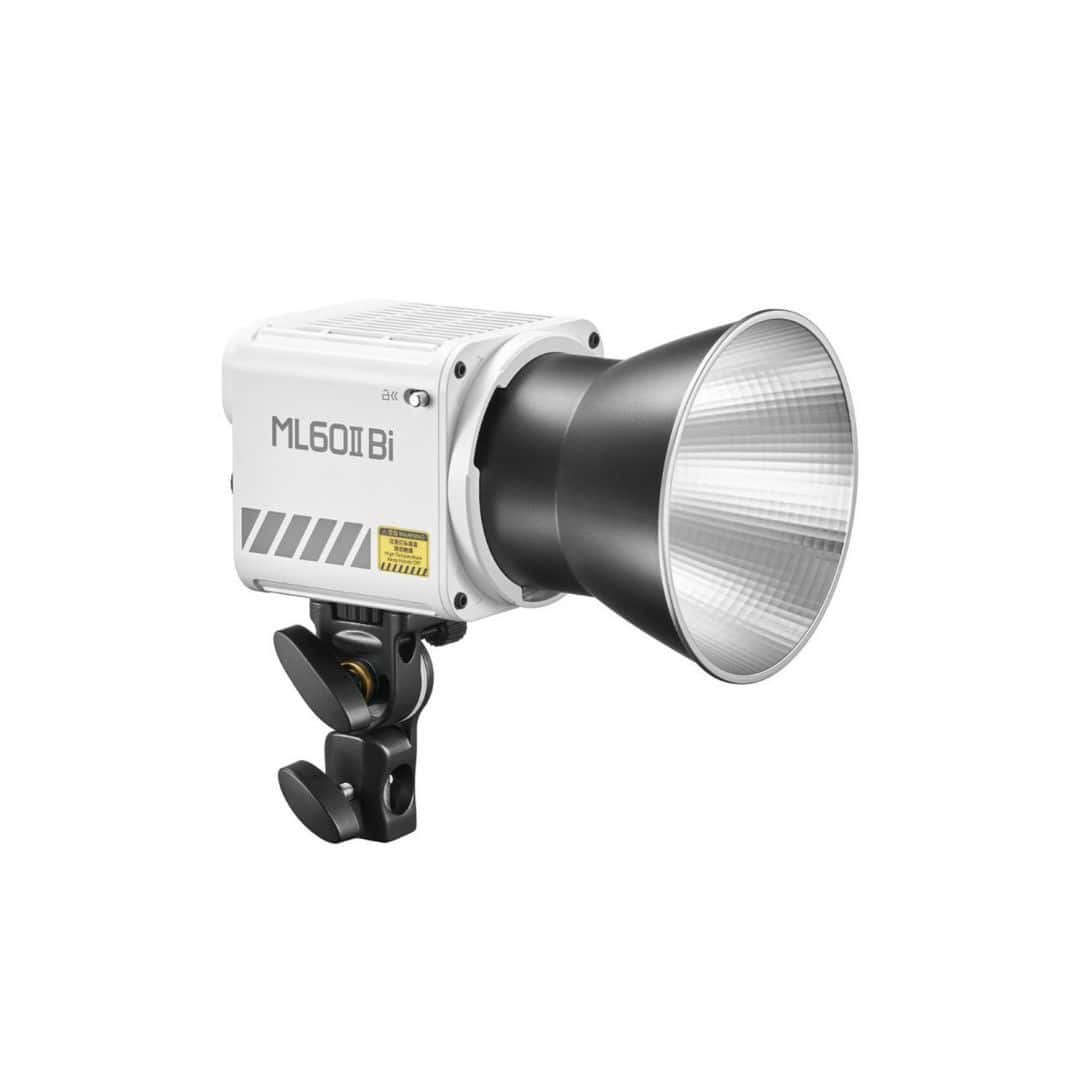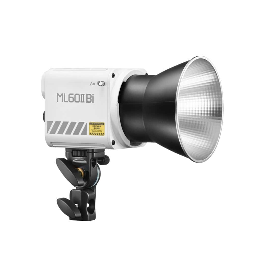 La luz Godox ML 60 II Bi, con su ajuste bicolor, permite cambiar entre luz cálida y fría (2800K-6500K), ideal para diferentes ambientes y efectos visuales sin necesidad de filtros de color. La luz es compacta y portátil, con opciones de alimentación por CA, lo que la hace ideal para uso tanto en estudio como en exteriores.