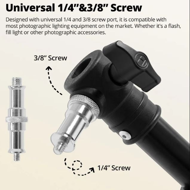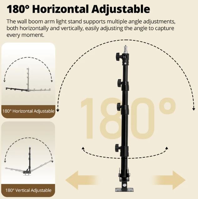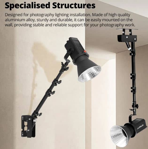 Soporte de luz de pared con ajuste de múltiples ángulos para posicionar luces de forma precisa. Perfecto para optimizar el espacio en estudios de fotografía o video.
