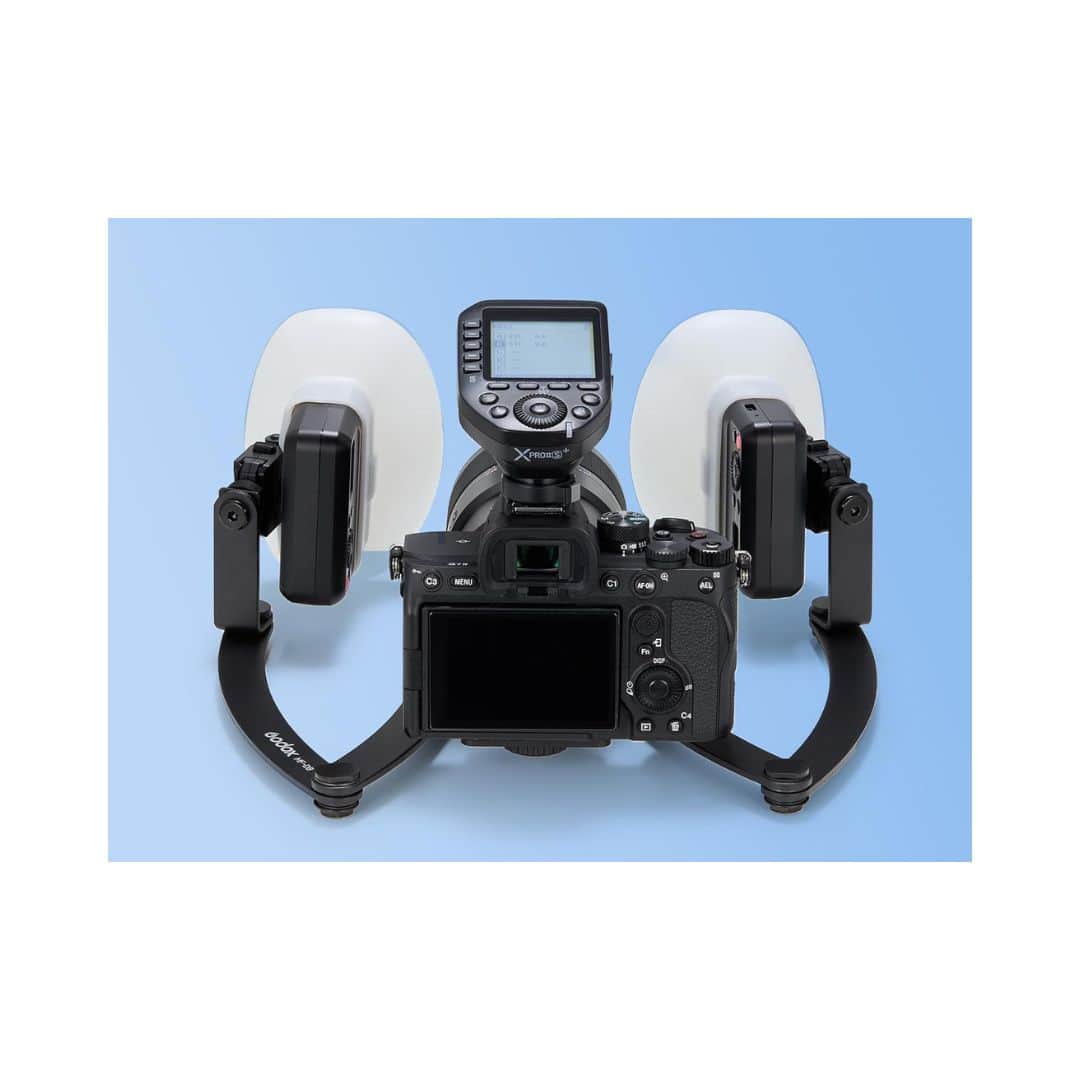 - Brazos plegables. Los dos cabezales de flash pueden rotar 180° sobre el soporte.